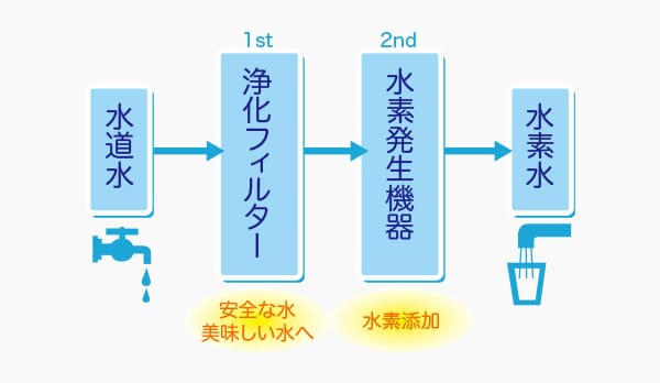 給水のたびに水素水を生成するワンパス方式を採用して、いつでも高濃度の水素水を安定供給!